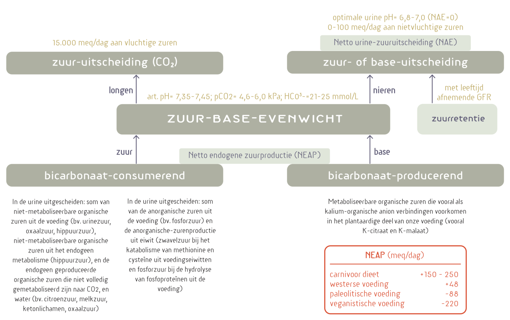 Diverse factoren zijn van belang voor onze zuur-basebalans van het bloed: de 'netto endogene zuurproductie' (NEAP), de long- en nierfunctie, en de leeftijd (figuur 2). De NEAP is het verschil tussen bicarbonaat-consumerende en -producerende factoren. De longen zorgen voor de uitscheiding van de bulk aan (vluchtig) zuur (15.000 meq/dag als CO2) en de nieren voor de uitscheiding van de niet-vluchtige zuren (westerse landen: 70-100 meq/dag, vooral zwavelzuur en fosforzuur). Bij een balans tussen aanvoer en afvoer van zuur hoort een arteriële bloed-pH tussen de 7,35 en 7,45. Deze wordt sterk gereguleerd. CO2-uitscheiding door de longen en van zuur door de nieren zijn dus bepalende factoren bij het constant houden van de arteriële bloed-pH.237-244