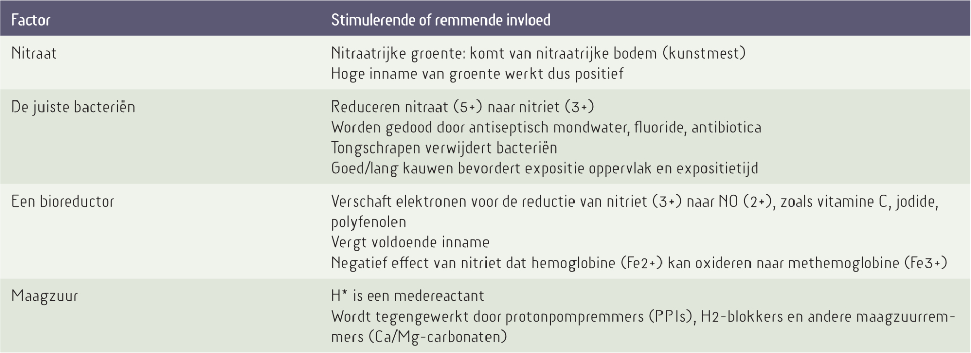 tabel 3 Factoren die in de nitraat-nitriet-stikstofmonoxide-syntheseroute de vorming van NO in het maag-darmkanaal en in de circulatie bevorderen en remmen. Ontleend aan de referenties 198, 203, 204, 207-214
